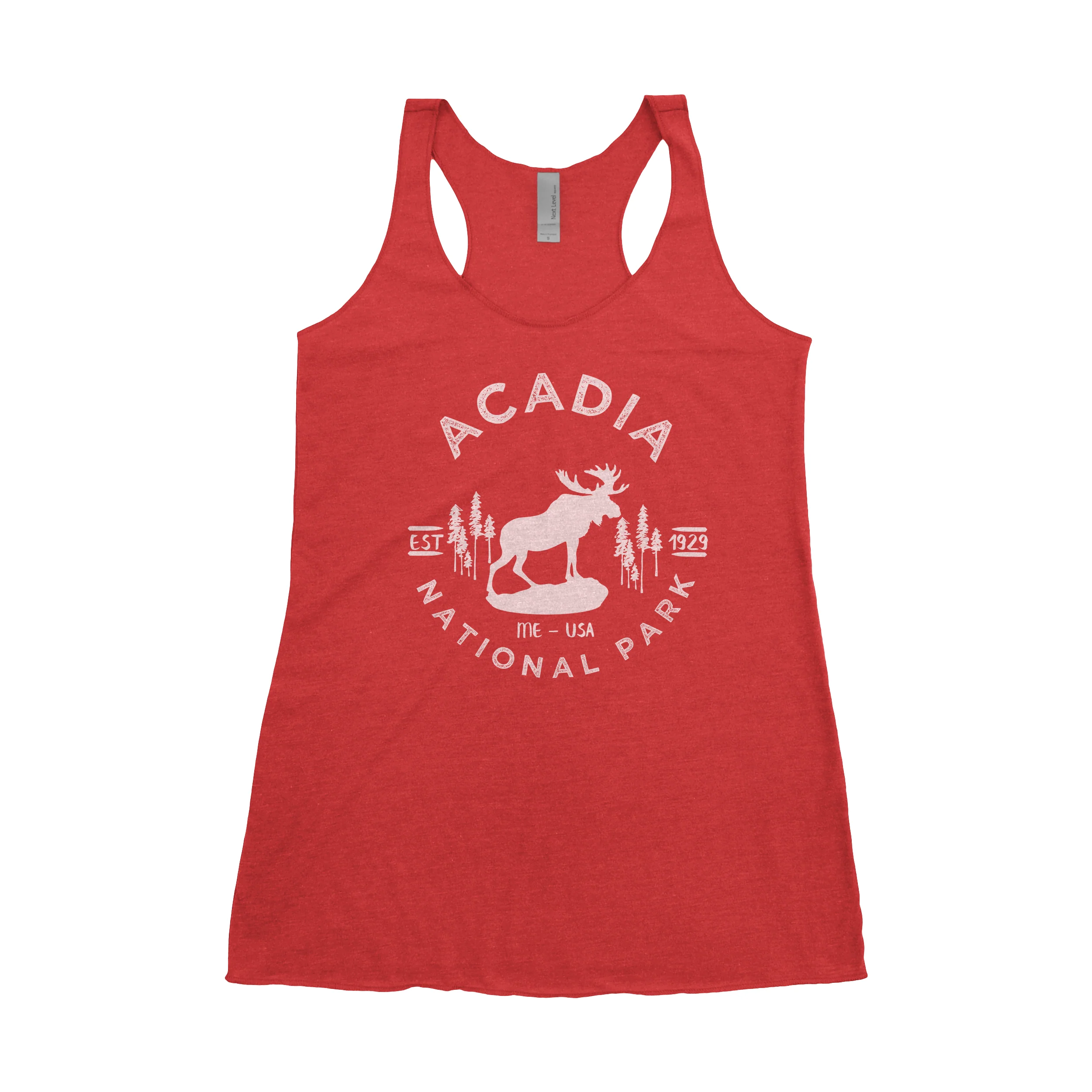 Acadia National Park Women's Tank features the Iconic Moose that roam Maine. Tank top is printed with white environmentally friendly water based ink. This ultra lightweight tank hits all the right trends: tri‑blend, racerback, and a flattering flowy fit.