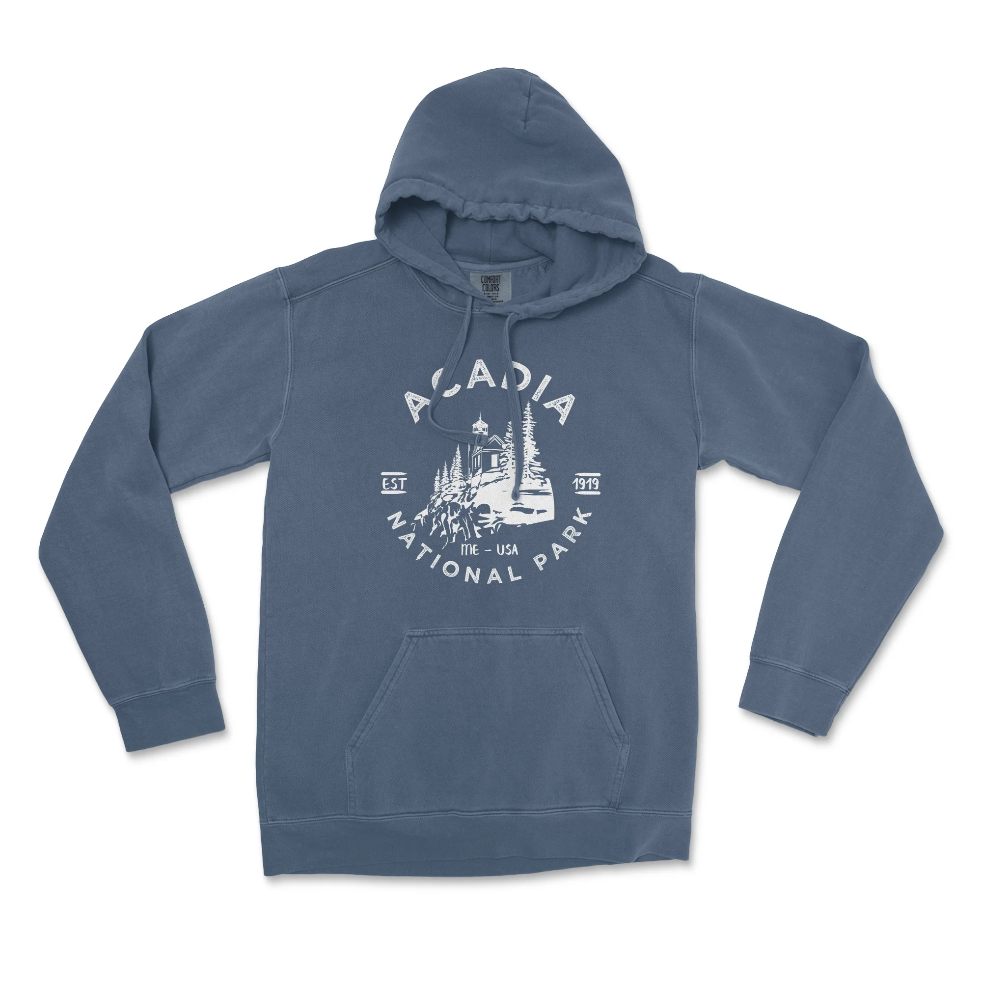 The Acadia National Park Comfort Colors Hoodie features the Iconic Lighthouse. It is printed with white environmentally friendly water based ink on the Vintage looking soft washed garment dyed unisex hoodie.