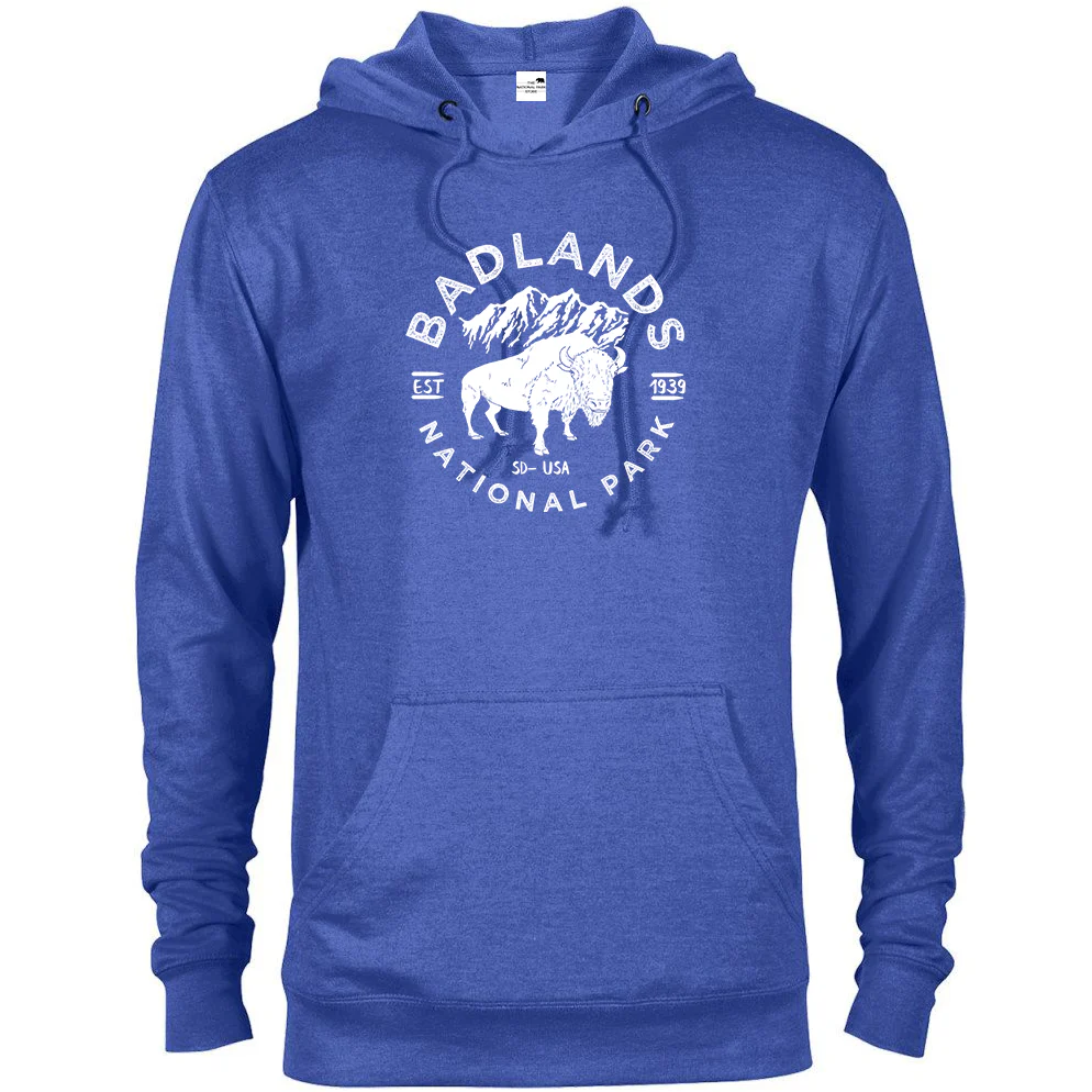 Badlands National Park Unisex Hoodie design features the iconic Bison that roam the park. Hoodie is printed with white environmentally friendly water based ink. The most comfortable hoodie you will ever own. Soft terry Pullover style overdyed, making the fabric ultra-soft and lending a heathered look.