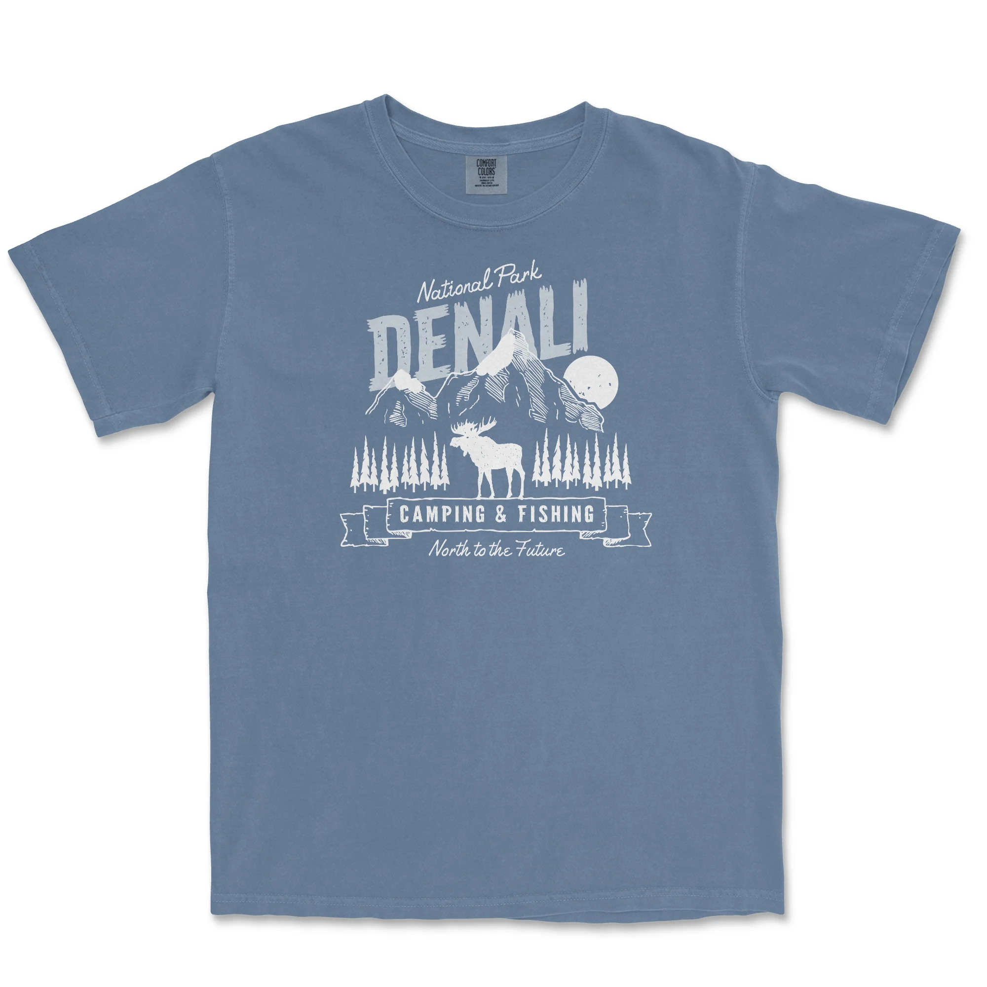 Denali National Park Comfort Colors T Shirt features Alaska's Mt McKinley and the popular Moose. It is printed with white environmentally friendly water based ink on a Comfort Color garment dyed T-shirt. These shirts are relaxed fit and heavy weight.