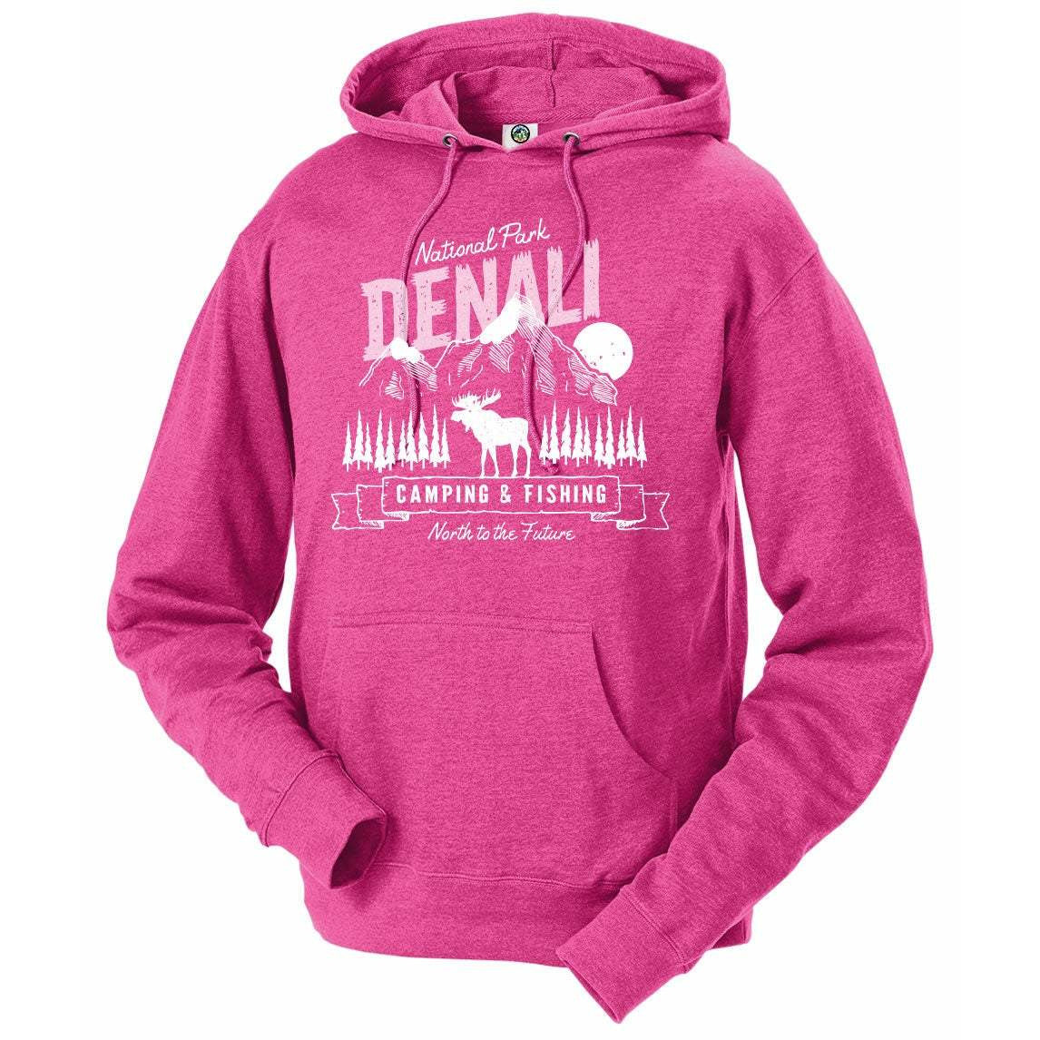 The Denali National Park Unisex Hoodie features the Moose across the tundra with Mount McKinley in the backdrop. It is printed with white environmentally friendly water based ink on a Unisex Ringspun pre-shrunk french terry Hoodie. The most comfortable hoodie you will ever own. Soft terry Pullover style overdyed, making the fabric ultra-soft and lending a heathered look.