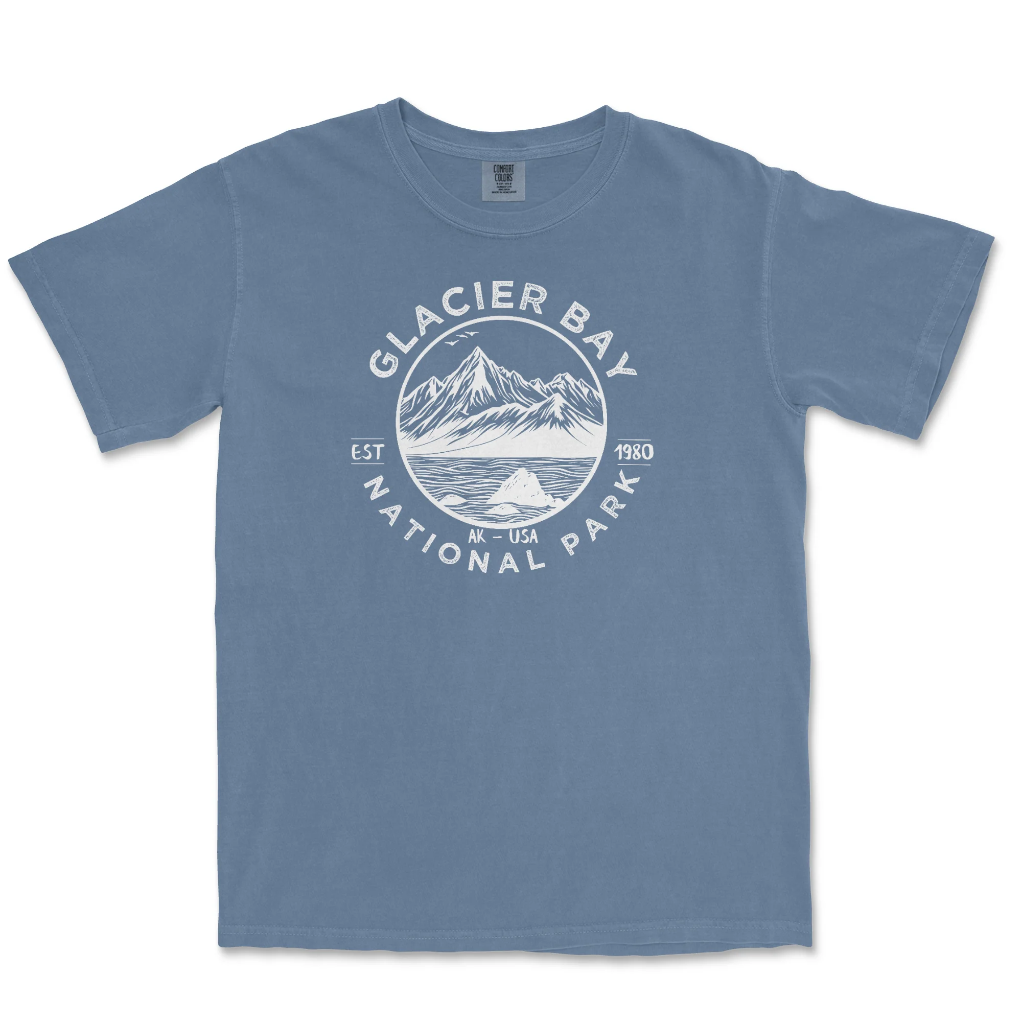 Glacier Bay National Park Comfort Colors T Shirt. It is printed with white environmentally friendly water based ink on a Comfort Color garment dyed T-shirt. These shirts are relaxed fit and heavy weight.