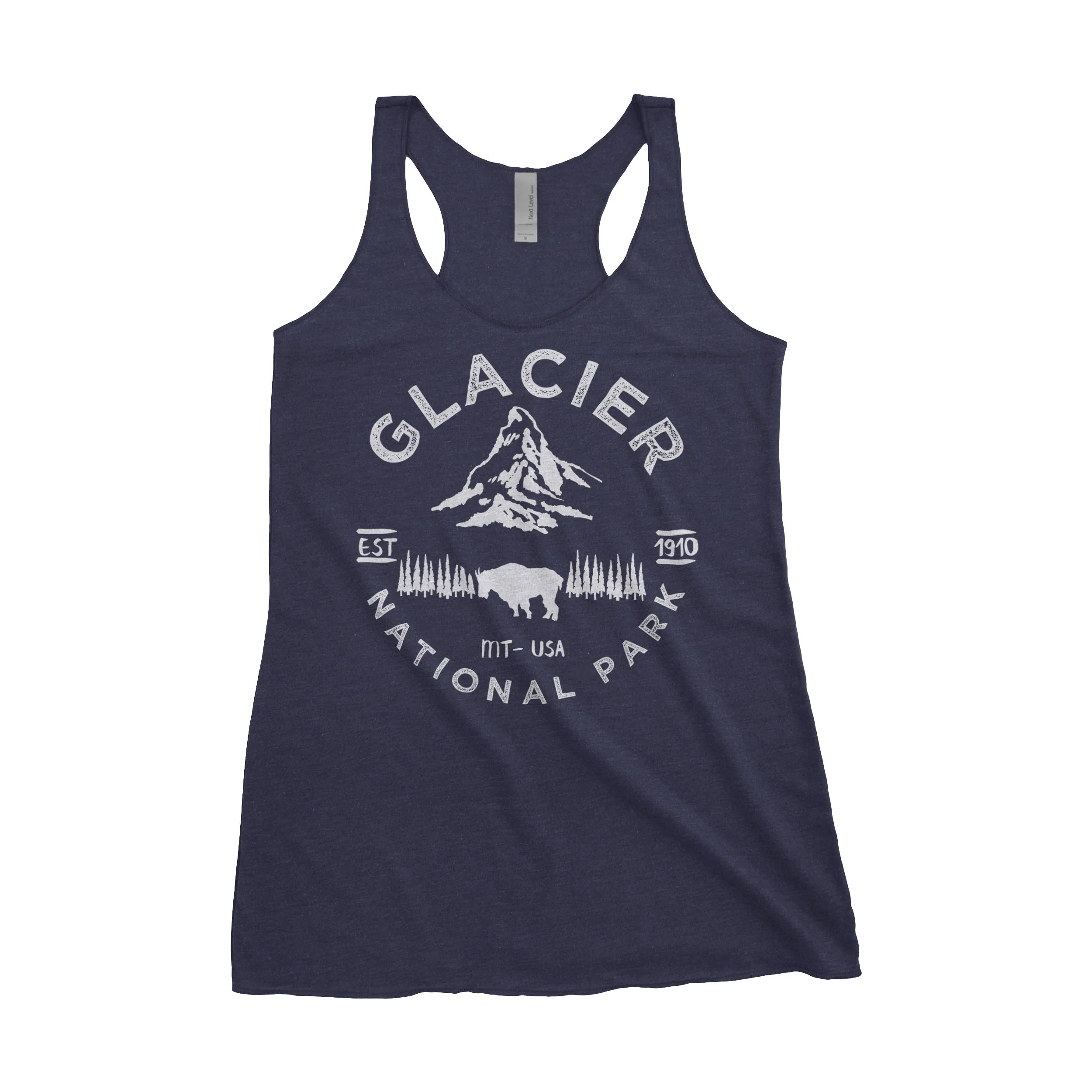 Glacier National Park Adventure Next Level Ladies Tri-Blend Tank features the Rocky Mountains and iconic Mountain Goat that reside in the park. Tank top is printed with white environmentally friendly water based ink on a Next Level Tri-Blend Tank. This ultra lightweight tank hits all the right trends: tri‑blend, racerback, and a flattering flowy fit.