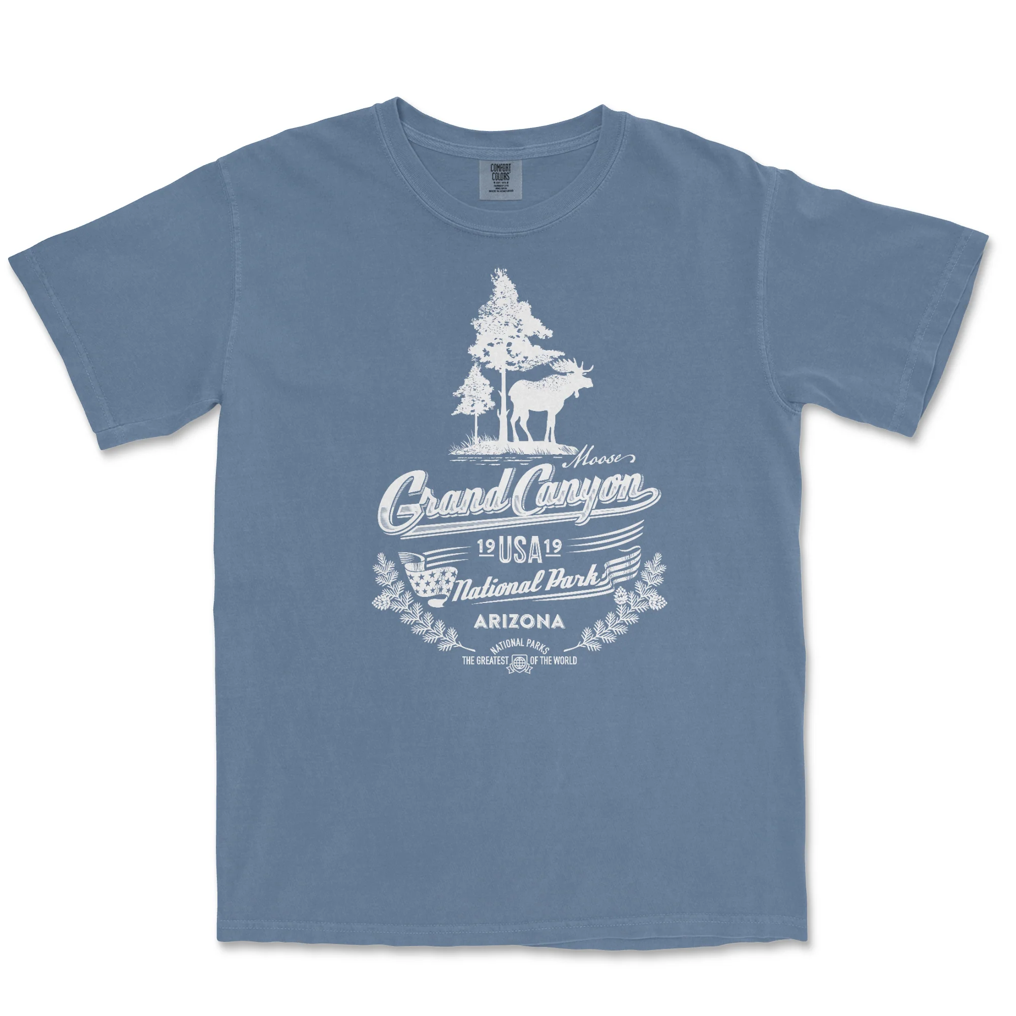 Grand Canyon National Park Comfort Colors T Shirt features the iconic Moose that frequent the South Rim and North Rim. It is printed with white environmentally friendly water based ink on a Comfort Color garment dyed T-shirt. These shirts are relaxed fit and heavy weight.