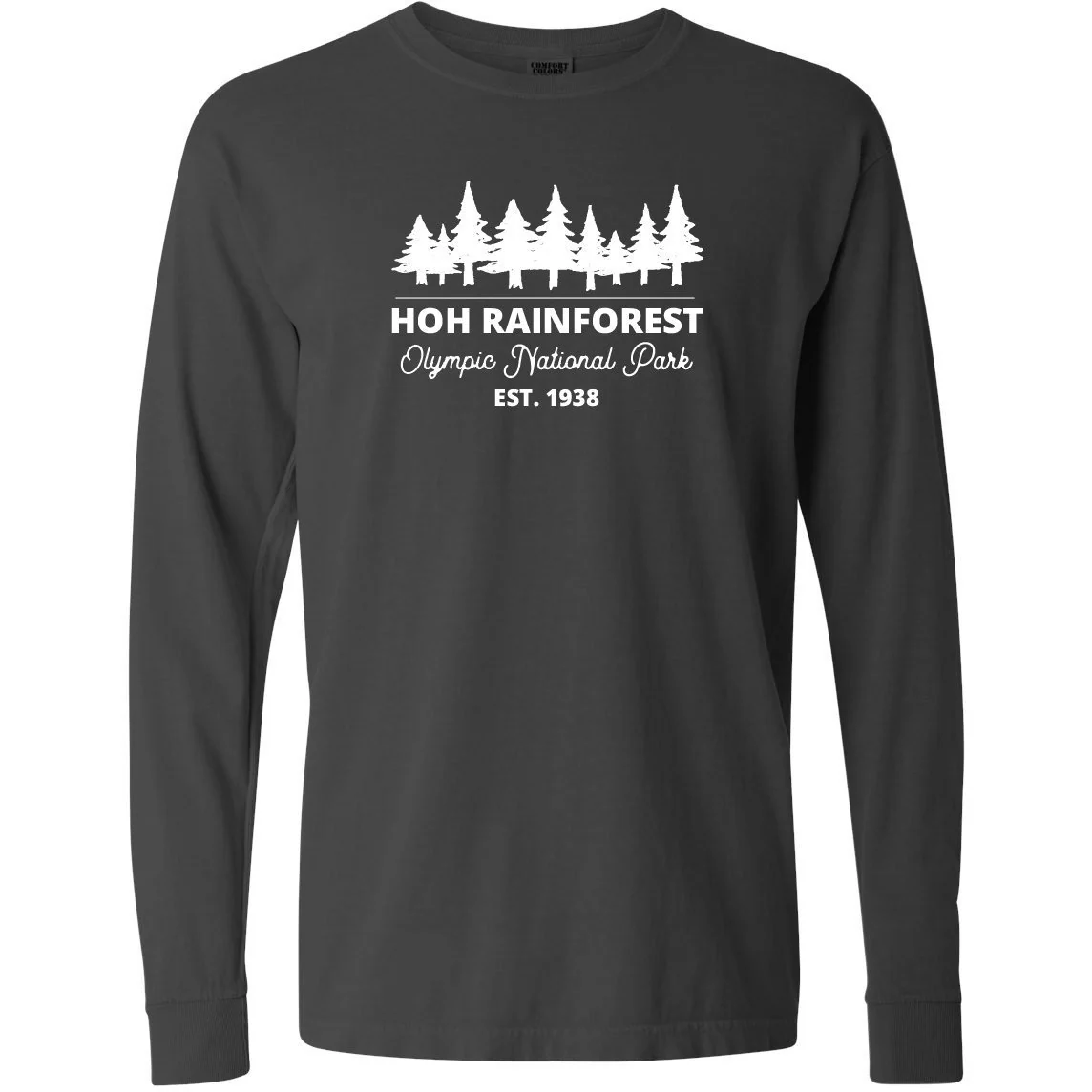 The Hoh Rainforest Olympic National Park Comfort Colors Long Sleeve T shirt features the protected forests. It is printed with white environmentally friendly water based ink on a Comfort Color garment dyed T-shirt. These shirts are relaxed fit and heavy weight.