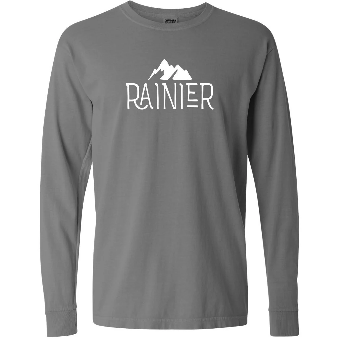 The Mount Rainier National Park Comfort Colors Long Sleeve T Shirt is printed with white environmentally friendly water based ink on a Comfort Color garment dyed T-shirt. Design features Mount Rainier. These shirts are relaxed fit and heavy weight.