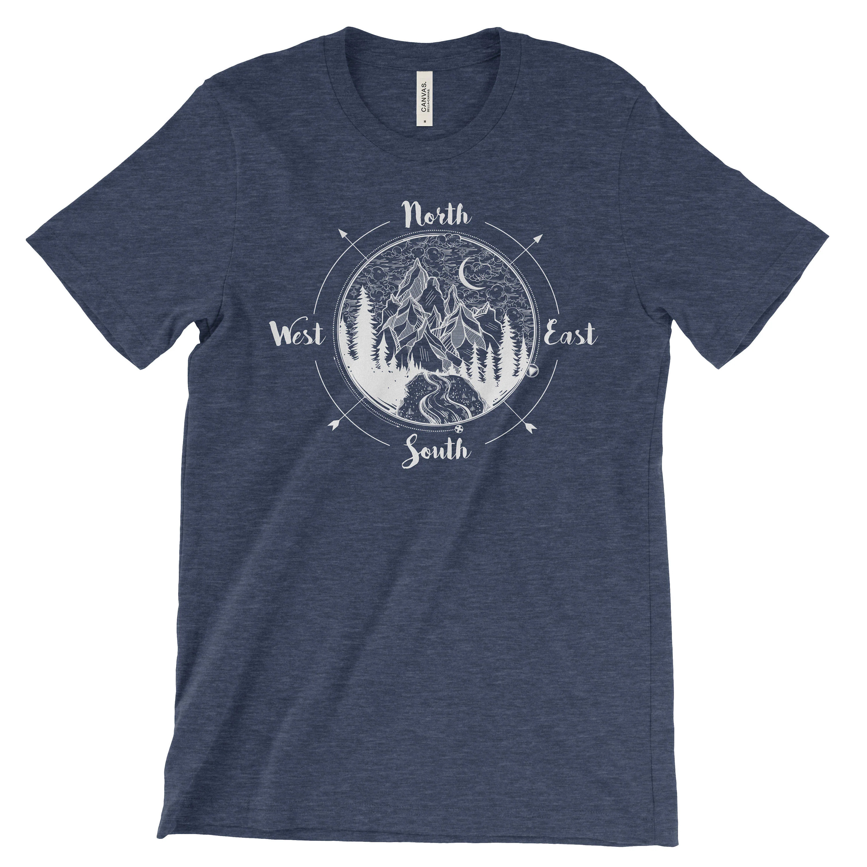 National Park Compass Adventure Unisex Bella Canvas T Shirt is printed with white environmentally friendly water based ink on a Unisex Bella Canvas t-shirt. Bella+Canvas super soft cotton t-shirt is made with premium quality knit cotton jersey. A modern unisex fitted shirt, this style features a crewneck and contoured side seams for a stylish trendy t-shirt.