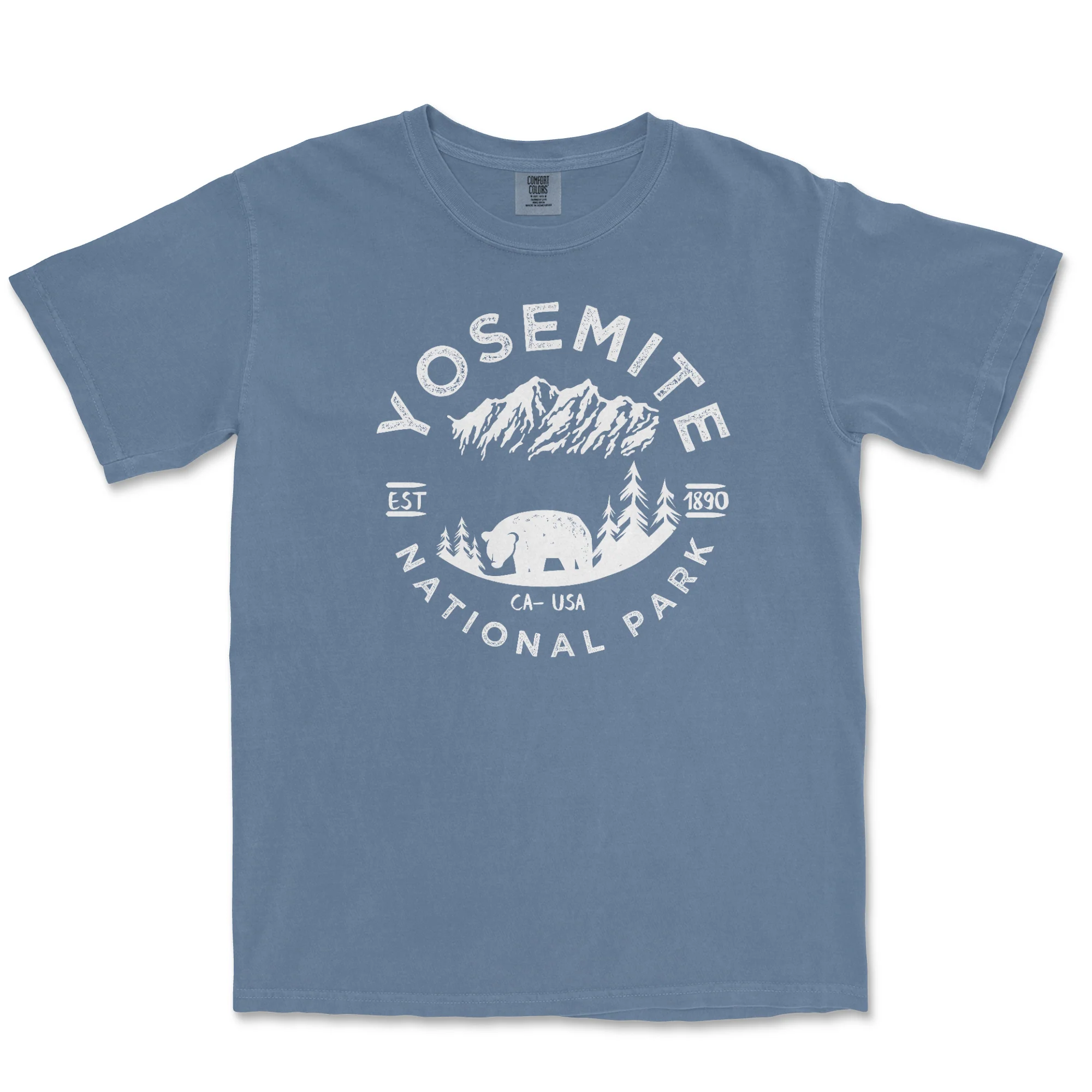 The Yosemite National Park Comfort Colors t shirt design features the Sierra Nevada Mountain Range with the iconic American Black Bear. T shirt is printed with white environmentally friendly water based ink on a Comfort Color garment dyed T-shirt. These shirts are relaxed fit and heavy weight.
